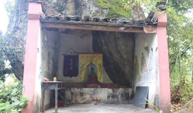 建筑简介:"该建筑坐北朝南,水泥砖混结构,单间,面宽 3.2米,进深3 米,硬山顶。庙的后身紧靠一块巨石,庙内建有一拜台,台正中间放有何仙姑神像,庙的东西两侧墙壁画有七位神仙图像。该建筑布局完整,结构够稳,内部被大树树干穿越,体现了建筑、自然相互交融的景象。该建筑形制典型,它是一处民间宗教信仰文化形态的宿影,对研究地方宗教文化有一定的历史与艺术价值,亦展现了建筑与自然共生的景象。"