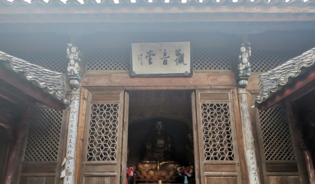建筑简介:位于威坪镇岭脚村东部凤凰山。据村民方凤海介绍该庙建于清代,坐西朝东,砖木结构,三进两轴四天井,建筑均为硬山顶,后堂为二层。正堂面宽六间 16 米,进深三间5.6米,穿斗式,,后堂面宽六间 16 米,进深三间3.4米,穿斗式,硬山顶。后堂佛庙有雕像四尊,正堂佛庙木雕像有九尊,前堂木雕像六尊,结构完整。