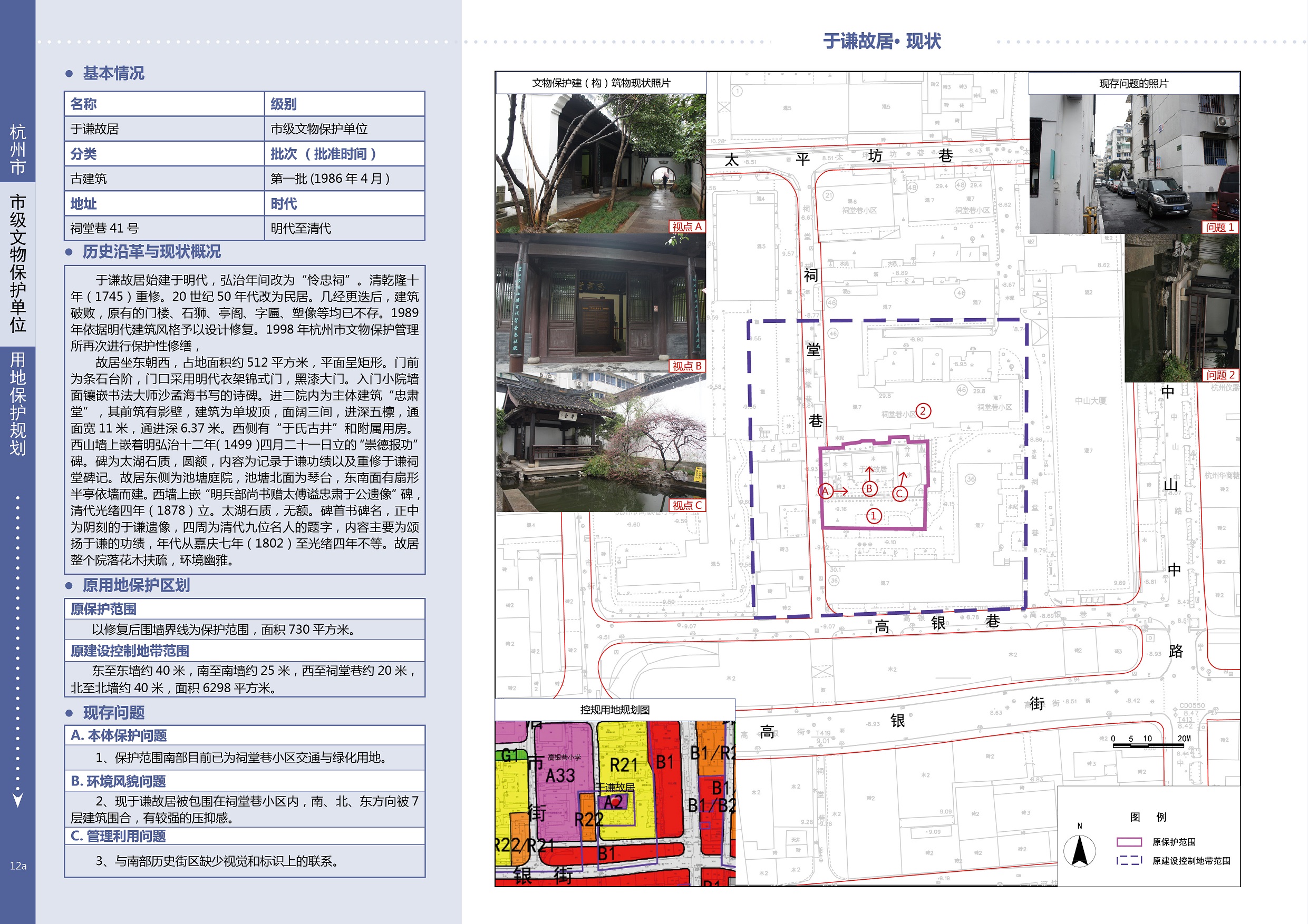 故居始建于明代,于氏数代居此。于谦离杭前的青少年时代在此度过。据《西湖游览志》等书记载:成化二年(1466),杭城百姓为纪念这位勤政为民的清官,“奉制辞怜忠之语”,将其故居称为怜忠祠;朝廷顺应民意,于弘治初年正式“敕建怜忠祠于故第”,祠堂巷也由此得名;清乾隆十年(1745)重修,“浙抚常安撰怜忠祠记”。