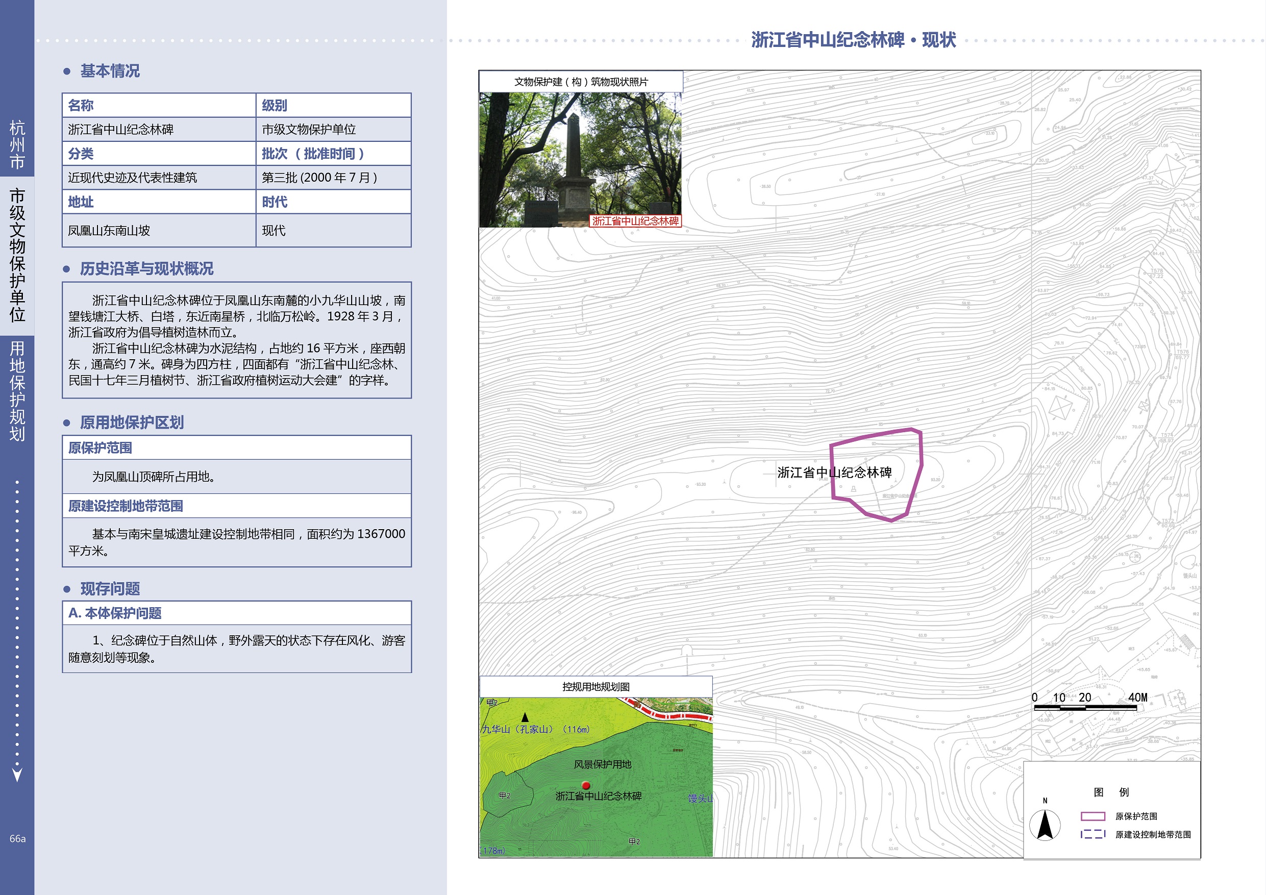 1928年3月,浙江省政府为倡导植树造林而立浙江省中山纪念林碑。碑占地约16平方米,坐西朝东,通高约3米。碑身为四方柱,四面都有“浙江省中山纪念林、民国十七年三月植树节、浙江省政府植树运动大会建”的字样。底座为须弥座,高与宽均为1.23米。底座分三层四面,两面有碑文、两面空白。朝南一面的碑文是一首五言律诗,东面的碑文是浙江省政府告示:“照得植树典礼,总理忌辰举行,择地凤凰山侧,建造纪念森林,用以永垂久远,自当保护认真,严禁放牧牛羊,更勿擅自斧斤。倘有摧残残踏,定当构案重惩,特此勒石告诫,其各一体凛遵。”碑身四周饰有覆莲、莲珠缝等。