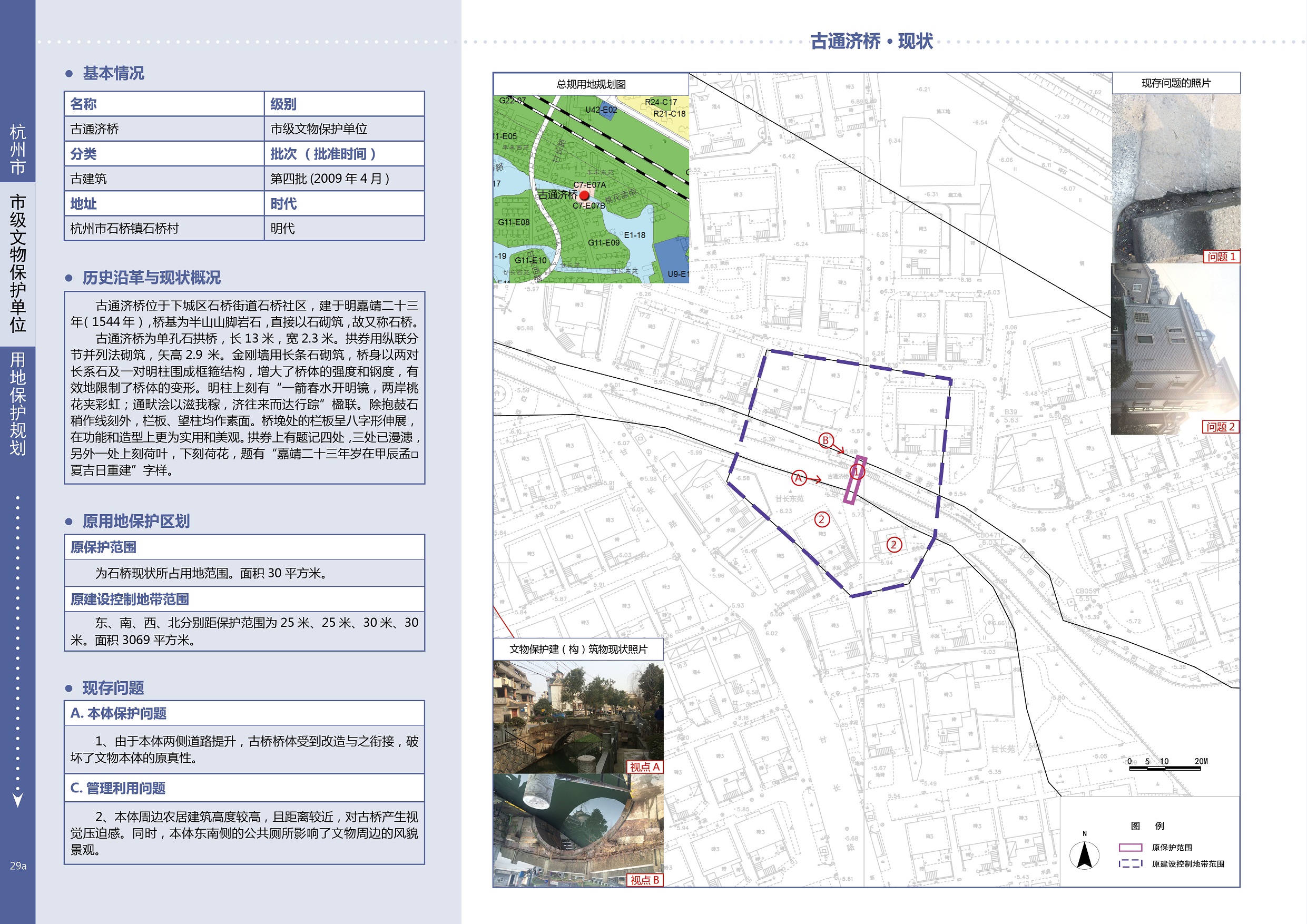 古通济桥南北向跨桃花漾,因桥基为半山山脚岩脉,直接以石砌筑,故俗称石桥。该桥建于明嘉靖二十三年(1544),为单孔石拱桥,长13米,宽2.3米。拱券用纵联分节并列法砌筑,矢高2.9米。金刚墙用长条石错缝砌筑,桥身以两对长系石及一对明柱围成框箍结构,有效地保证了桥体的稳定。明柱上刻有“一箭春水开明镜,两岸桃花夹彩虹;通畎浍以滋我稼,济往来而达行踪”楹联。除抱鼓石稍作线刻外,栏板、望柱均作素面。桥堍处的栏板呈八字形,在功能和造型上更为实用和美观。拱券上有题记四处,三处已漫漶,另外一处上刻荷叶,下刻荷花,题有“嘉靖二十三年岁在甲辰孟□夏吉日重建”字样。