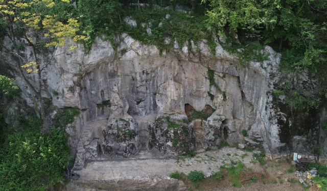 三佛石下坎岩壁上雕有十八尊罗汉,由于历史原因和文革时期的破坏,罗汉像遭受了不同程度的损毁。幸运的是离地面较高的一个罗汉像保存完好,尚可以看出衣褶飘举的线条感。