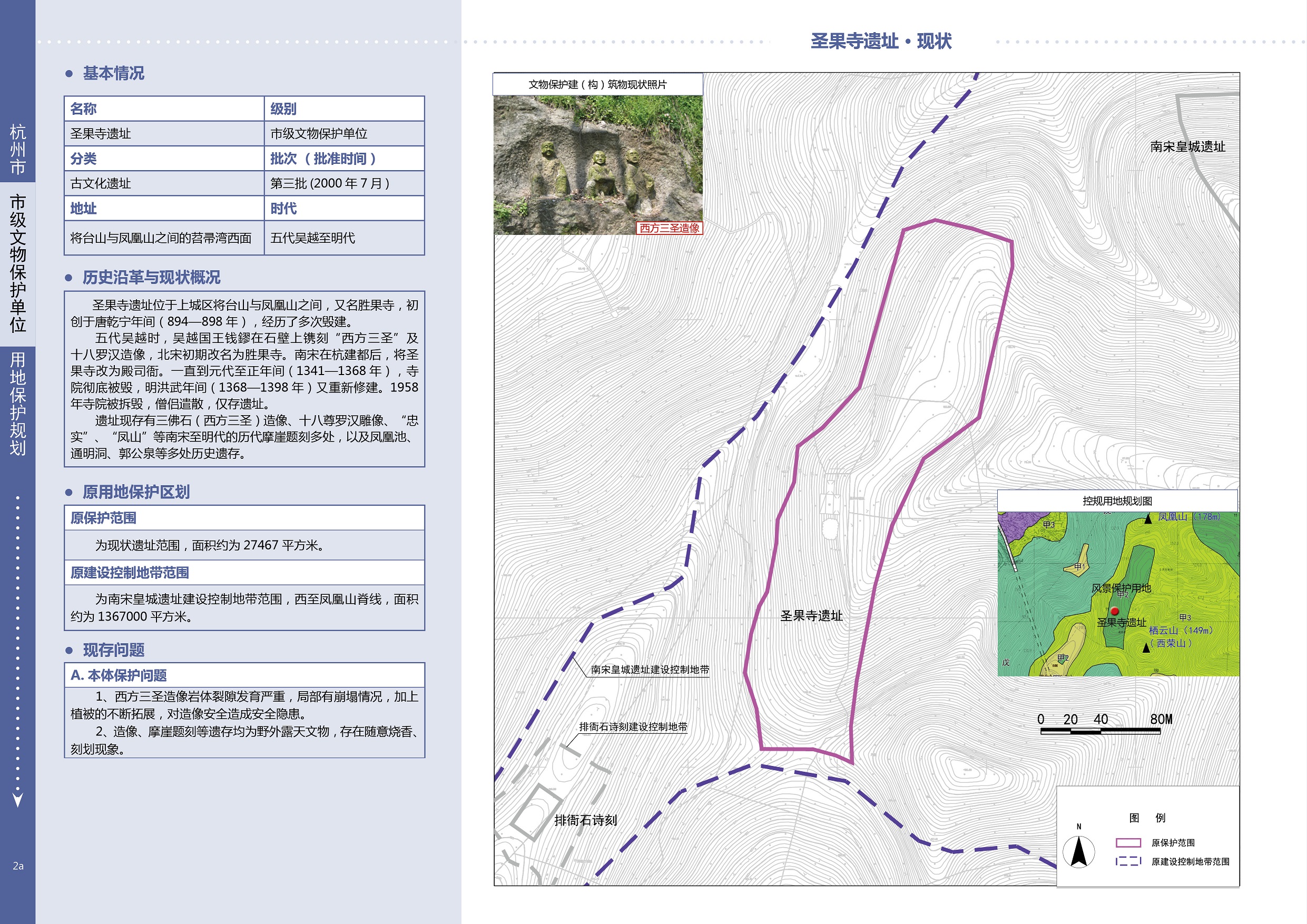 五代吴越时,吴越国王钱鏐在石壁上镌刻“西方三圣”及十八罗汉,北宋初期改名为胜果寺。南宋在杭建都后,将圣果寺改为殿司衙。一直到元代至正年间(1341~1368),寺院彻底被毁,明洪武年间(1368~1398)又重新修建。1958年寺院被拆毁,僧侣遣散,仅存遗址。