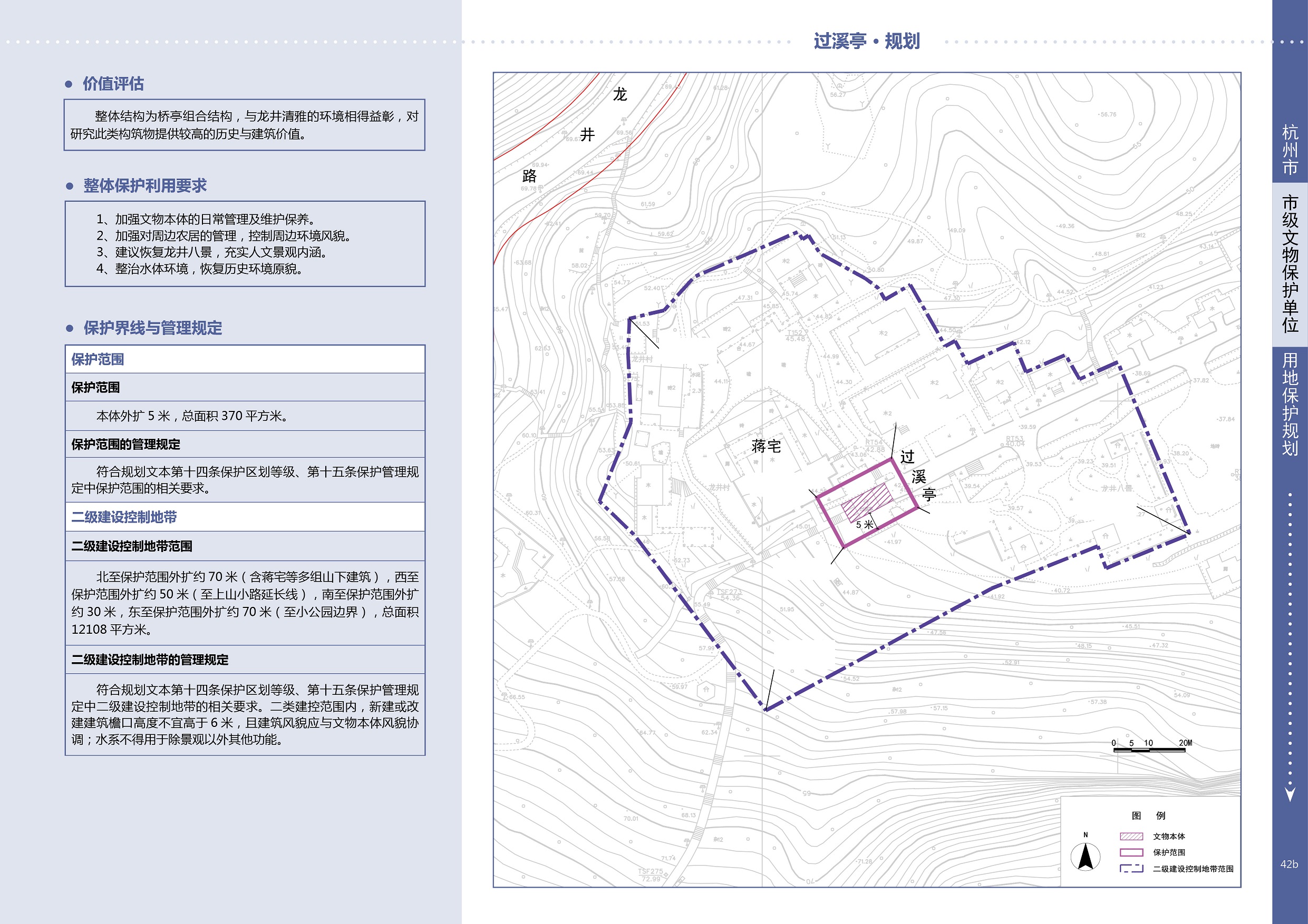 此亭始建于北宋元丰年间,又名二老亭。《西湖游览志》载,“苏子瞻访辩才龙井,送至岭上,左右惊呼曰:‘远公过虎溪矣’。辩才笑曰:‘杜子有云,与子成二老,来往亦风流’。遂作亭岭上,名曰‘过溪’,亦曰‘二老’。”