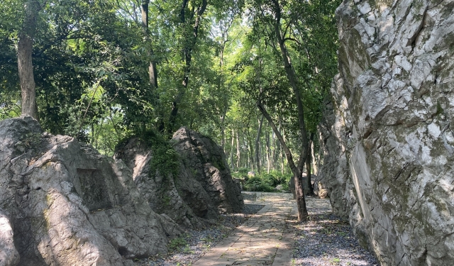 排衙石因两排怪石如从卫拱立而得名,又称“排牙石”、“石笋林”、“队石”。在平整的四顾坪中间有数十株石芽冒出地面,簇拥如林,石芽群分列两队,中间敝开似门,供人穿行。据记载,吴越国王钱鏐定杭州为国都后,有一次带领部下策马上山,看到这群石芽苍翠玲珑,森若朝拱,便取名“排衙石”。