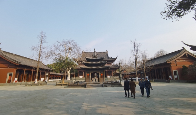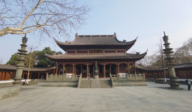 钱王祠坐东南朝西北,面向西湖,由山门、五王殿、献殿、碑亭(2座)、功臣堂(2座)、揽远堂、怀慎堂、庆系堂、依光堂、阅礼堂、戏台等建筑组成。