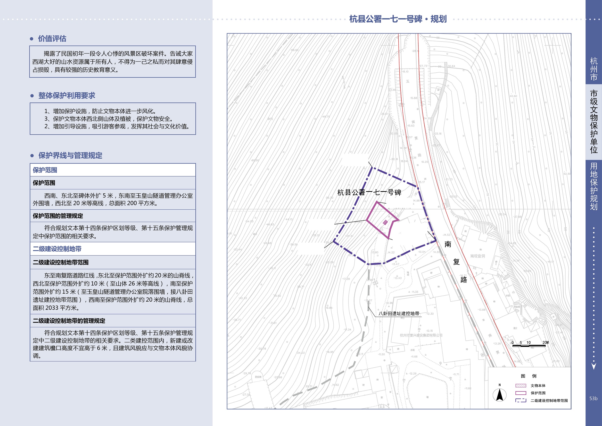 碑文保存基本完整,内容为杭县公署禁止非法采石布告。玉皇山山体主要由石灰岩组成,石灰岩可以烧制成多种实用材料,开采之事获利丰厚,常有不法之徒凭借各种手段来盗采,以致山体和名胜古迹受损。民国时期,张巨川勾通王盛麟、冯畅亭等人,将玉皇山山麓作为采石场,盗采石料卖给上海水泥公司,影响极为恶劣。杭县公署为处理张巨川案,惩诫盗采行为,特发布第一七一号布告,告诫“凡玉皇山界内,以及毗连支山,无论公有私有,永远封禁开采。”签发人为杭县知事陶镛,发布时间为民国十二年(1923)十一月十一日。