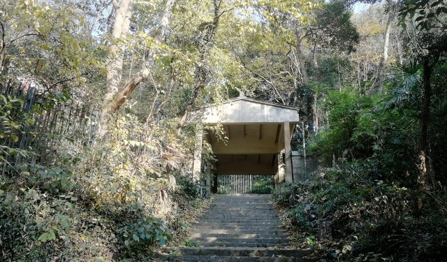 四宜亭为山阶间过路凉亭,平面长方形,南北各立三根石柱承托人字形亭顶,亭顶盖瓦,南北两侧柱间设石条凳。
