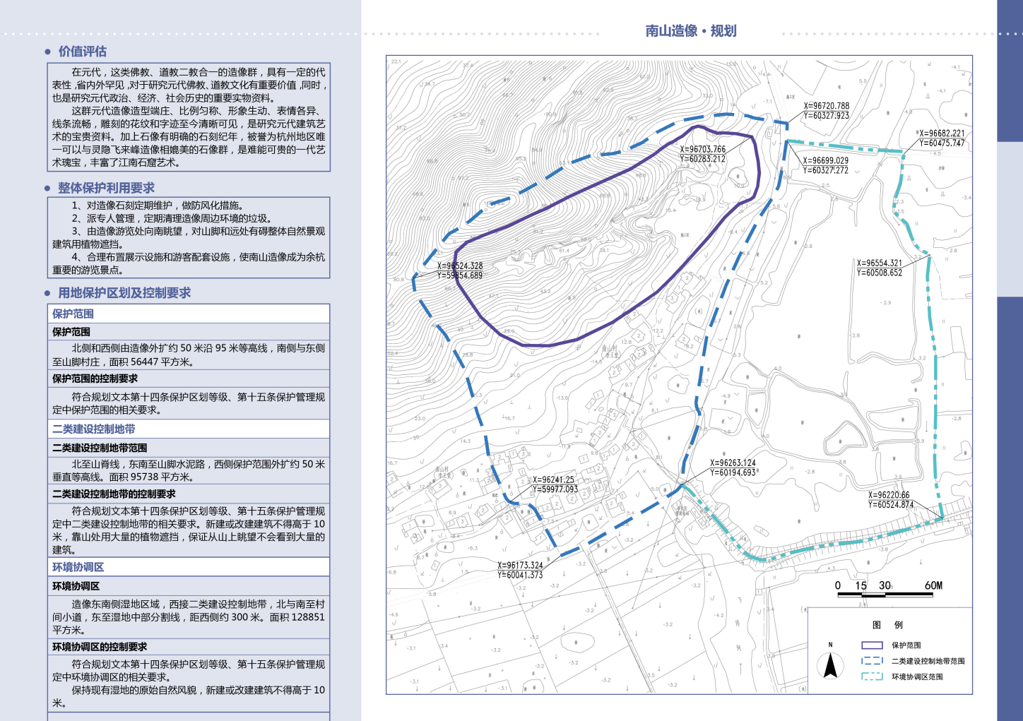南山造像造型端庄、比例匀称、形象生动、表情各异、线条流畅,是研究元代宗教造像艺术及雕刻工艺的宝贵资料。7号如来坐像体量高大,在浙江省内极为少见。3号尊华宿王智佛像和11号阿弥陀如来坐像的左肩侧均刻有纪年题记,提供了断定年代的准确依据。南山造像作为一处造型多样,佛、道二教合一的造像群,丰富了江南地区摩崖造像艺术,被誉为杭州地区唯一可以与灵隐飞来峰造像相媲美的石像群,是难能可贵的艺术瑰宝,也为研究杭州及江浙地区元代政治经济、社会历史、艺术文化提供了重要的实物资料。1963年列为县级文物保护单位。1983年重新公布为第一批县级文物保护单位。1997年列为浙江省文物保护单位。2013年列为全国重点文物保护单位。
