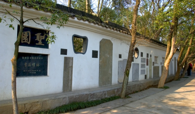 圣园碑林于1985年建成。九十年代末因学校改建,碑林移至小黄山,现位于新登古城范围内。廊墙通长56米,高2.35米,占地面积400平方米。石刻“圣园”二字为现代书法家黄苗子所题。碑林内共有新老碑刻37通,种类有庙碑、祠碑、墓碑、禁碑等。新碑均为现代书法名家所题。古碑有唐末著名文学家、诗人罗隐的墓碑;有明清时期的记叙罗隐在新登城鸡鸣山书院读书情况及一生业绩的《鸡鸣山记》碑和《学山碑记》;有明刻的《宋儒范氏心箴碑》和《程子动箴碑》等。