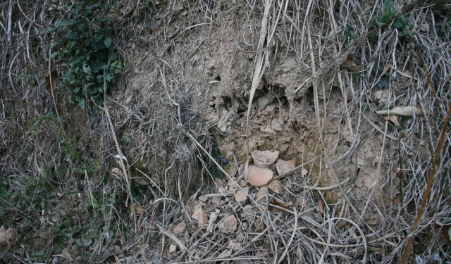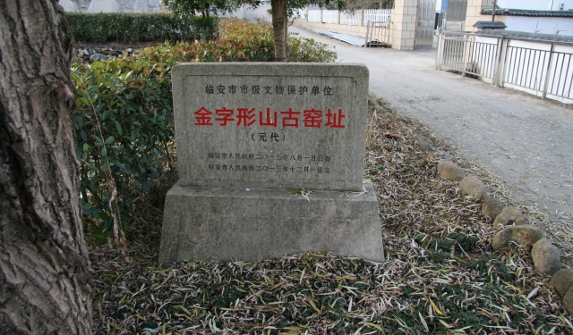 金字形山位于阔滩村西部,在窑址区域范围内,地表瓷片分布面积约800平方米。该窑址以生产青瓷为主,据采集的标本看青瓷胎显深灰色,胎质较紧密,有少许沙粒,釉色有青黄、青灰,较滋润,胎体较厚,胎釉结合较好,采集标本有碗、罐等。