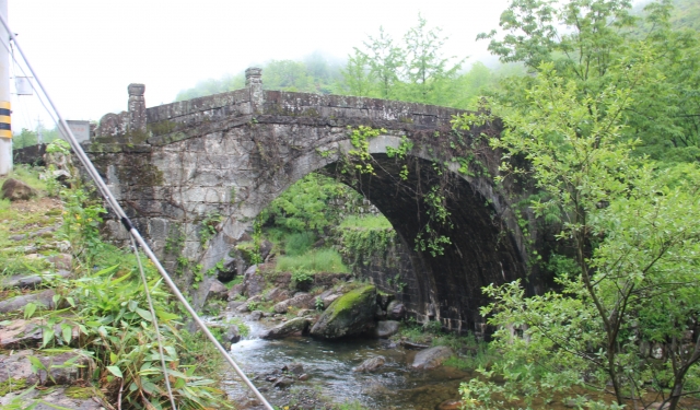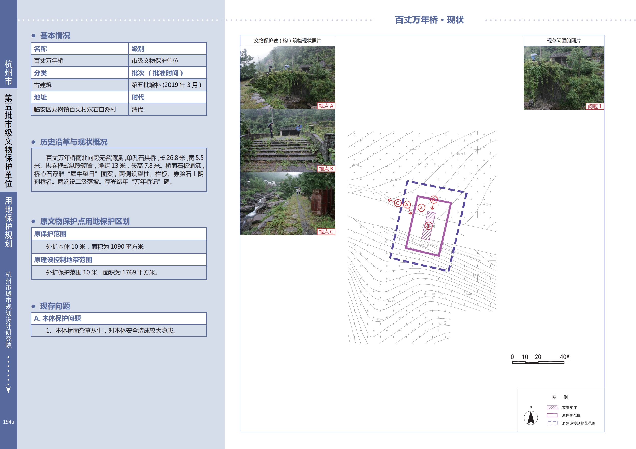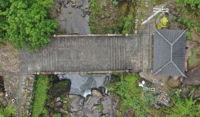百丈万年桥始建于清光绪三十三年(1907),南北向横跨山涧小溪,南侧为关帝殿,紧邻村中道路,北侧为树林,东、西侧为百丈古道。