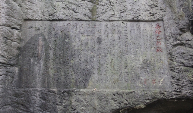 明代石刻一:镌刻于嘉靖七年(1528)。内容为“嘉靖戊子七月,前进士兵部郎中吴苑庐襄、刑部主事吴兴屠应峻奉使江西,来游,桐庐知县沈椿陪。”