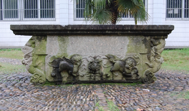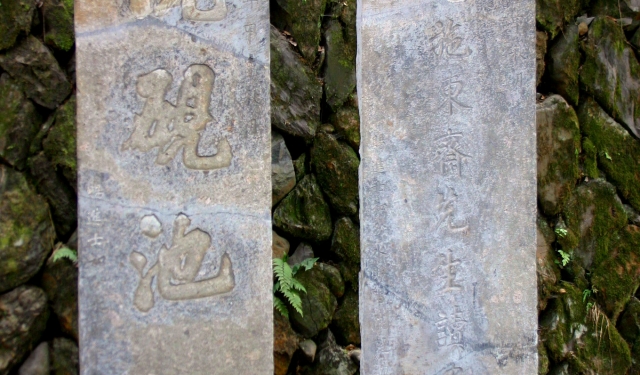 “唐状元施东斋先生读书处”碑立于清道光七年(1827),碑高224厘米,宽62厘米,厚7厘米。“洗砚池”碑立于清道光四年,阳刻“洗砚池”三字,行书,落款“甲申秋月”。碑高216厘米,宽62厘米,厚8厘米。均为分水县知事饶芝立。石雕供桌原位于关帝庙内,临近洗砚池。桌面长249厘米,宽107厘米,通高90厘米,高浮雕麒麟戏珠、龙纹等图案。