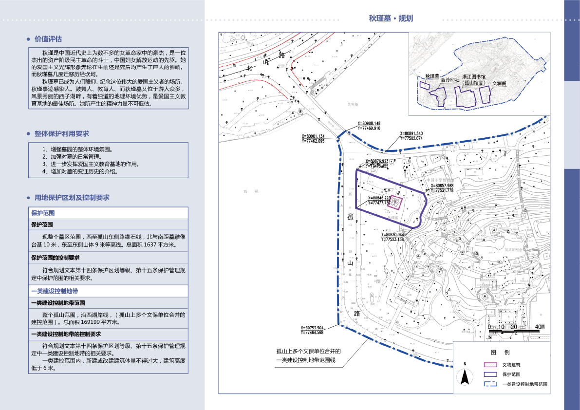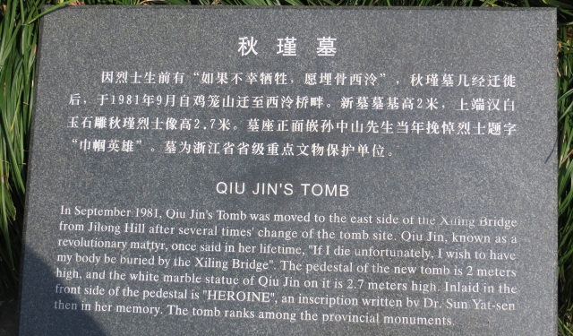 秋瑾墓坐东朝西,用花岗岩砌筑,方形,高1.75米,正面镶嵌孙中山先生当年挽悼题字手迹“巾帼英雄”,上款“鉴湖女侠千古”,下款“孙文”。背面嵌徐自华撰、吴芝瑛书《鉴湖女侠秋君墓表》,全文722字。墓表为旧墓原物。基座上为汉白石雕刻的秋瑾烈士像,高270厘米,头梳髻,眼望前方,炯炯有神,上穿大襟唐服,下着百褶散裙。左手插于腰际,右手按剑,端庄英武,潇洒飘逸,浩气熠熠。