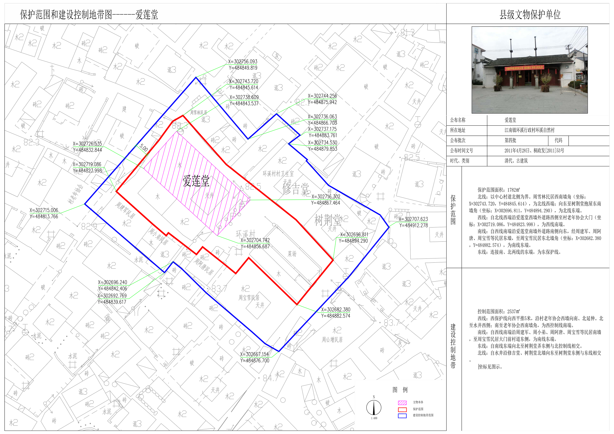 爱莲堂坐北朝南,占地面积541平方米,砖木结构,双坡硬山顶,分为前、中、后三进,五开间。前进正立面置八字大门,明间用三柱六檩,前双步间为内八字门墙和花格平顶檐廊,廊前设两支高1.95米的方形旗杆石。后檐檩刻有丹凤朝阳等图案,梁架结构沉稳,月梁肥厚。前、中进之间置天井,以卵石铺筑,两侧为过廊。过廊梁架用二柱三檩。中进明间用四柱九檩,内五架梁带前后双步,明间宽畅,后金柱间置太师壁,陈设有条案桌椅,悬挂“爱莲堂”木匾额。太师壁后为退堂,自退堂可进入后进。后进明间用三柱六檩。