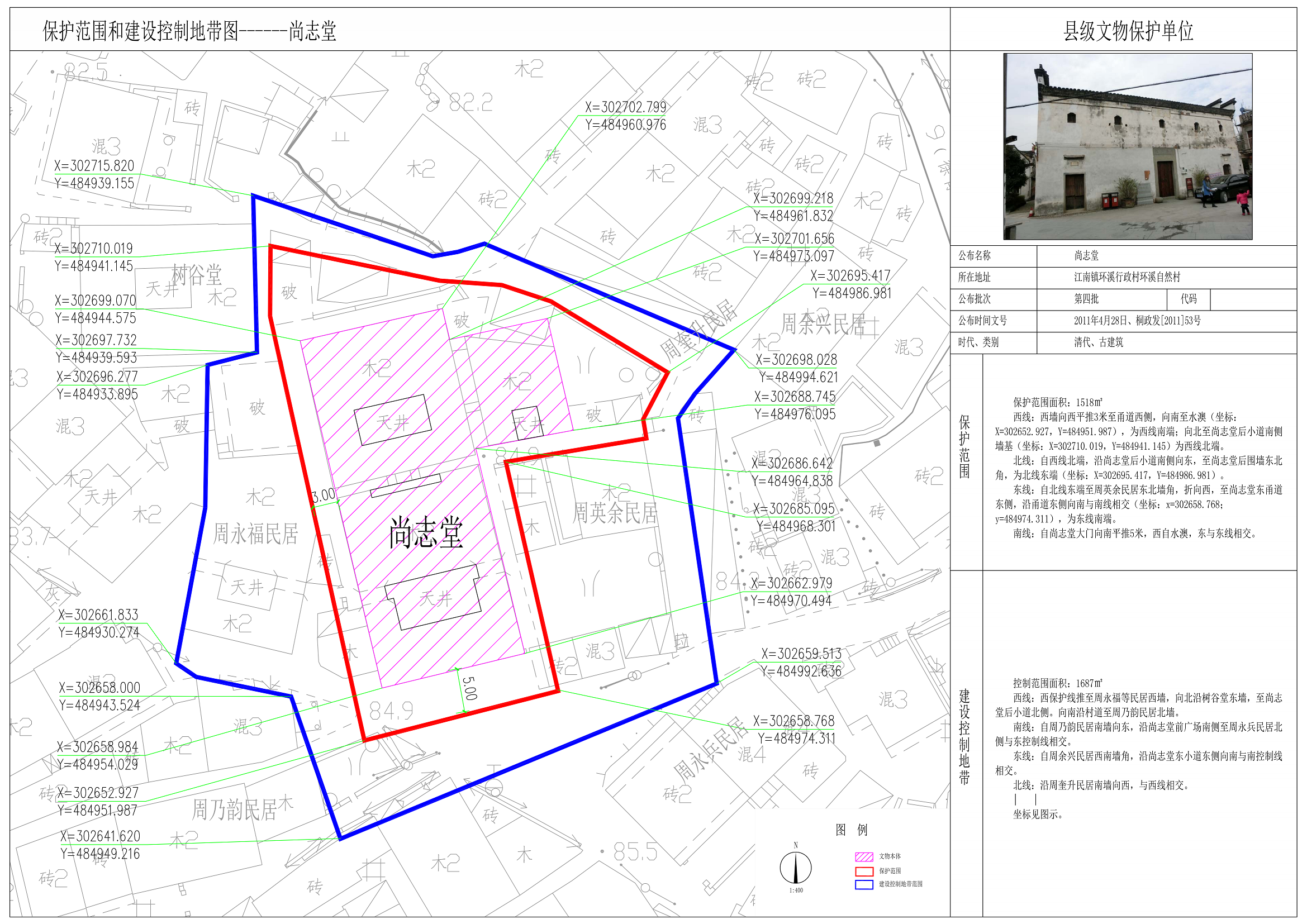 尚志堂建于清道光年间(1821~1850),坐北朝南,总占地面积850平方米,砖木结构,马头墙,双坡硬山顶,由五开间四进二层四合式主院落和东侧三合式私塾组成。主院落东、西两侧各有长40余米的卵石甬道。
