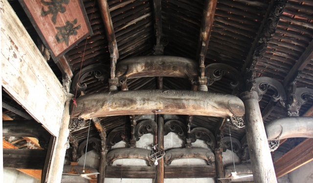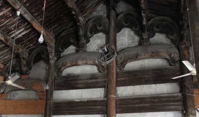 启承堂坐东朝西,占地面积167平方米。三开间单层,砖木结构,双坡硬山顶,穿斗、抬梁式混合结构。明间五架梁带前后双步,用四柱九檩,立柱粗大,月梁肥厚,雀替、斗栱构件齐整,整体梁架沉稳,榫卯规矩,契合紧密。屋面草架原始结构保存较好。