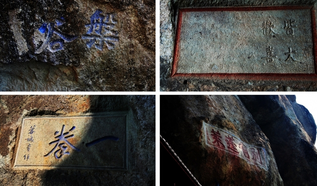 “别有蓬莱”题刻:位于地藏王殿上方悬崖峭壁上,横书,每字约0.6米见方。右首上款:戊寅年九秋吉旦;左首下款:龙游张照。