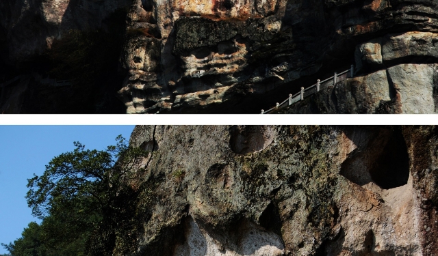 “一拳”题刻:行书,每字约0.5米见方,落款“蓉城李□”。题刻位于地藏王殿西岩壁上,大慈岩山麓,是由中生代侏罗纪火山碎屑岩构成的山体。山形诡奇,五峰如指曲成拳,直冲云霄,最高海拨692米,“一拳”题刻可谓此处的真实写照。