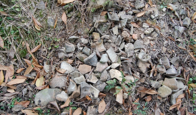 窑址面积约6500平方米,文化层堆积面积约2500平方米,堆积厚度0.6-1.2米不等。地表散落瓷片、窑具残件等,局部聚集成堆,在凸坡中部及西侧可见红烧土碎块。瓷片以带釉粗瓷为主,多见罐、缸类废品堆积,碗类产品少见,制作较粗,器型、釉色单一。地表可见大量支座及其残件。