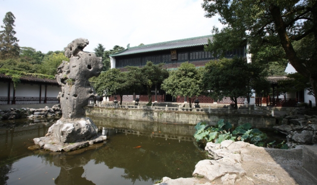 文澜阁是一处典型的江南庭院建筑,园林布局的主要特点是顺应地势的高下,适当点缀亭榭、曲廊、水池、叠石之类的建筑物,并借助小桥,使之互相贯通。园内亭廊、池桥、假山叠石互为凭借,贯通一起。
