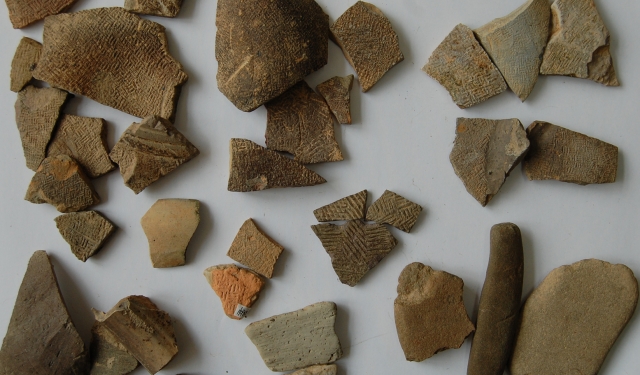 经初步勘探,该遗址分布面积约有10000平方米以上,文化层厚度有0.2-1米左右。从采集的标本看,以印纹陶为主,器型以罐的腹部、口沿、陶钵残片居多,还有少量石器,如砺石、磨石;陶质以灰陶为主,少量红陶;纹饰以几何纹为主,主要有席纹、折线纹、素面纹,其中席纹最多。初步断定为新石器时代良渚文化晚期遗存。