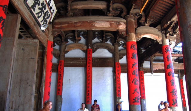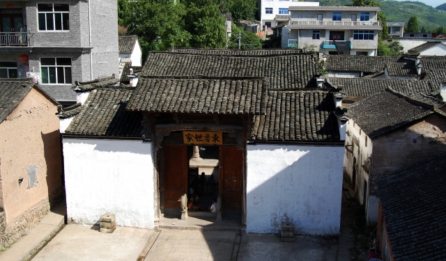 门厅与享堂之间有厢房连接,形成“四水归堂”的风水格局。天井构筑精致,四周青石铺砌,筑有一条约30厘米宽,30厘米深的凹字形水沟,水沟的四角铺有雕刻简洁的过水洞口,天井中央呈台状。第三进为寝堂,前有“日、月”天井,为两层楼房,面阔三间一弄,进深三柱两间五檩。