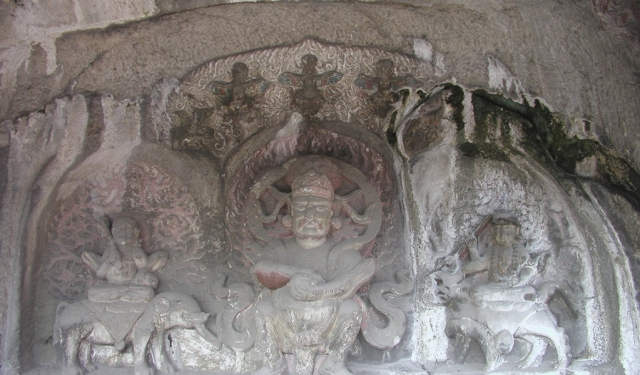 麻曷葛剌为梵文(mahakala)的音译,汉文译为“大黑天”,佛教密宗认为大黑天是“大日如来”降魔时所现的愤怒药叉王的形象,此神于元初由国师八思巴送入元廷。元朝皇帝奉麻曷葛剌为军神,令各军营中供奉。在远离元大都的南宋故都杭州来镌造这龛有着降魔形象的麻曷葛剌造像,有着明显的政治因素,也可从一个侧面印证元统治者征服异族的决心。
